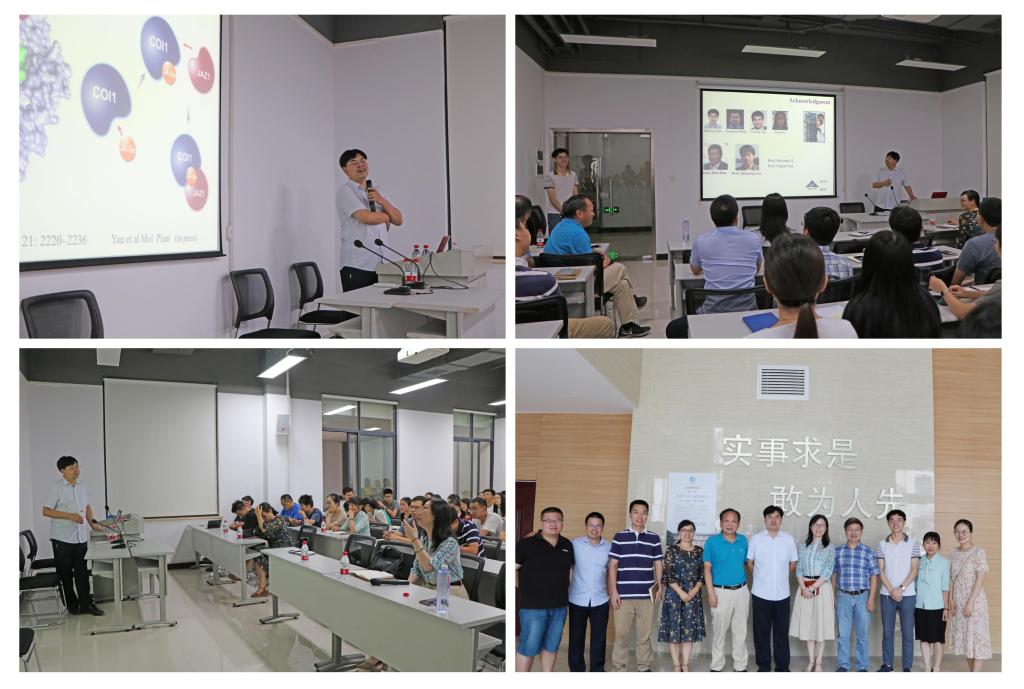 谢道昕教授的报告主要分享了其课题组在“植物激素调控植物生长发育和防御反应的分子机制”领域的研究成果,着重介绍了植物抗性激素茉莉素作用机理方面的最新研究进展。谢教授从植物面临的各种生物、非生物胁迫出发,结合自身科研经历,深入浅出地介绍了茉莉素受体蛋白的发现,并系统地阐述了茉莉素被其受体蛋白识别后,诱导抑制子蛋白的降解,从而激活多种不同转录因子的转录活性,达到调控植物育性和防御反应的生物学功能。着重介绍了其课题组新发现的一个三元蛋白复合体通过调控茉莉素合成、来调节植物抵御昆虫噬咬的分子机制。