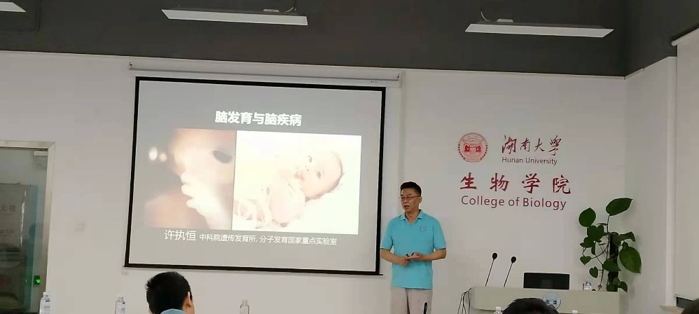 许老师在本次报告中介绍了他研究团队在寨卡病毒和自闭症方面的研究进展。2015年以来,寨卡病毒在全世界蔓延,导致新生儿小颅畸形,其发病机制并不清楚。许老师课题组利用显微注射器将寨卡病毒注射到胎鼠的大脑里,结果显示小鼠的皮层厚度减少了,进一步分析结果显示寨卡病毒可以感染神经元干细胞从而造成大量的免疫反应,然后杀死众多神经元,最后皮层变薄,导致小颅畸形,为阐释寨卡病毒感染导致新生儿小颅畸形提供了直接证据和机制解析。接下来,许老师课题组对寨卡病毒感染及其导致的新生儿小颅畸形的治疗进行探索研究,用他研究团队制备的抗寨卡病毒的人源化基因工程抗体注射到感染了寨卡病毒的孕鼠体内,结果显示该抗体不仅能有效地中和孕鼠体内的寨卡病毒,而且非常有效地阻止了寨卡病毒感染和小颅畸形。许老师的精彩报告让广大师生了解寨卡病毒研究领域的最新进展及学术成果,出席学术交流报告会的师生与许老师进行了充分交流互动,许老师为大家分析问题,提出解答。最后,讲座在一片热烈的掌声中圆满结束。