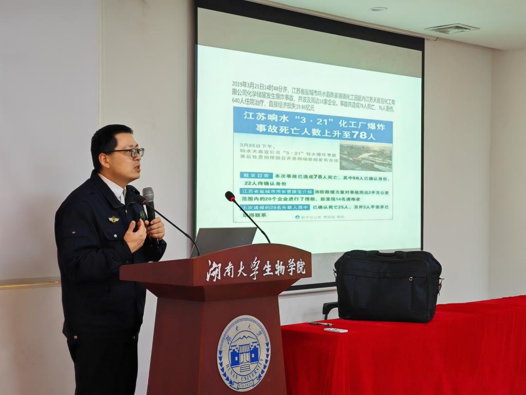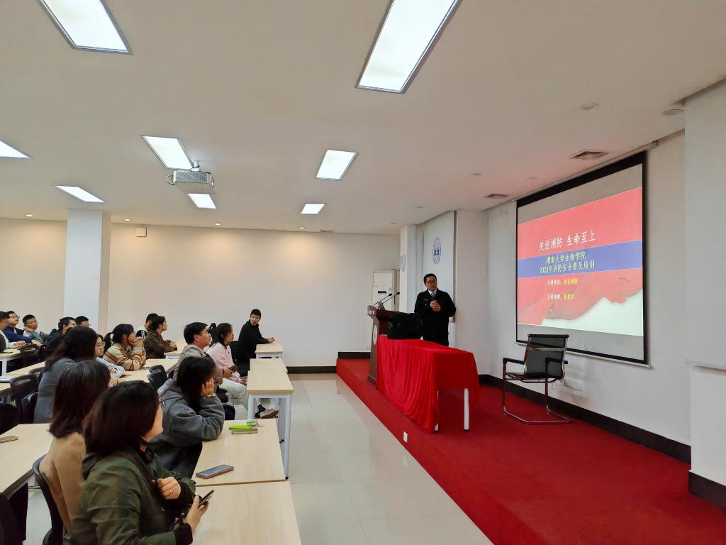 张教官结合以往发生的重大火灾事故案例,重点讲解了消防基础知识、灭火常识、火灾逃生自救、基本消防器材使用操作演练等方面知识,并结合实验室安全主题介绍了切实可行的防火措施和管理办法。
