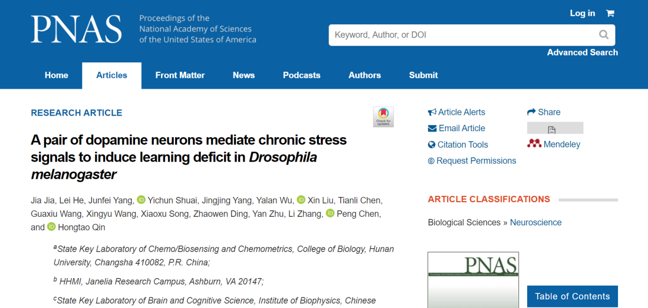 、化学生物传感与计量学国家重点实验室覃宏涛教授团队领衔完成的研究论文“A pair of dopamine neurons mediate chronic stress signal to induce learning deficit inDrosophila melanogaster”(一对多巴胺神经元介导慢性应激信号诱导黑腹果蝇的学习障碍)。该论文首次报道了慢性应激诱导的学习障碍(chronic stress-induced learning deficit,CSLD)与黑腹果蝇的抑郁样状态有关,并初步揭示多巴胺神经系统调控CSLD易感性的神经环路机制。本论文是多个单位共同合作的成果,参与单位包括湖南大学、昆明医科大学、霍华德休斯医学研究所珍妮莉娅法姆研究园区、中科院生物物理研究所、中科院大学等。湖南大学为第一通讯单位,湖南大学生物医学工程专业研究生贾佳、杨珺斐和贺磊为同等贡献第一作者,覃宏涛和陈鹏为共同通讯作者。该研究受到国家自然科学基金、湖南省自然科学基金、云南省自然科学基金等多个项目的资助,还得到了多位国内外同行的支持和帮助。