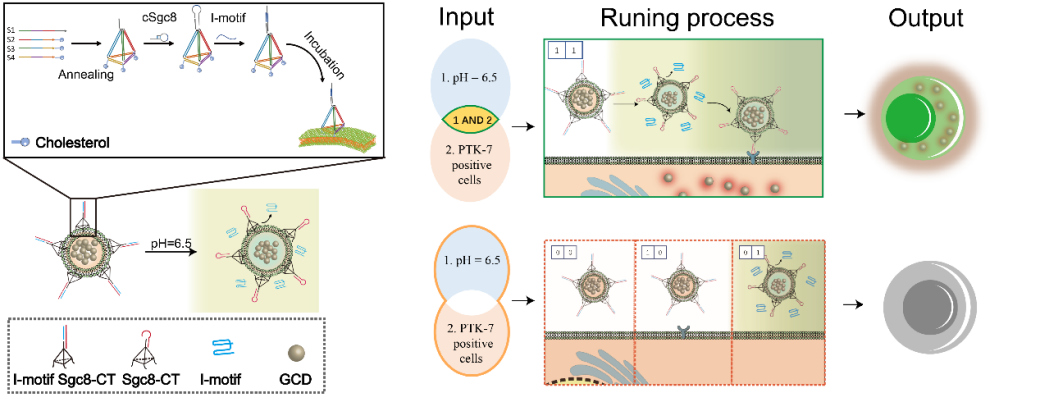 图2. 基于DNA 逻辑门控的人工细胞设计思路及识别原理示意图
