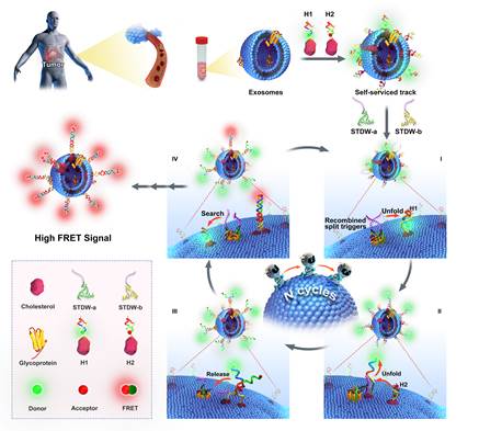 基于此,研究团队利用外泌体表面的磷脂双分子层作为三维行走轨道,以SMMC-7721肝癌细胞外泌体表面高度表达的N-糖蛋白(GalNAc)为靶标,采用特异性识别的N-糖蛋白裂开型核酸适配体作为分子识别探针,结合催化发夹自组装反应,开发了一种轨道自助型三维DNA步行器(STDW),通过分析N-糖蛋白表达水平实现肿瘤外泌体免洗、高灵敏检测研究(图1)。