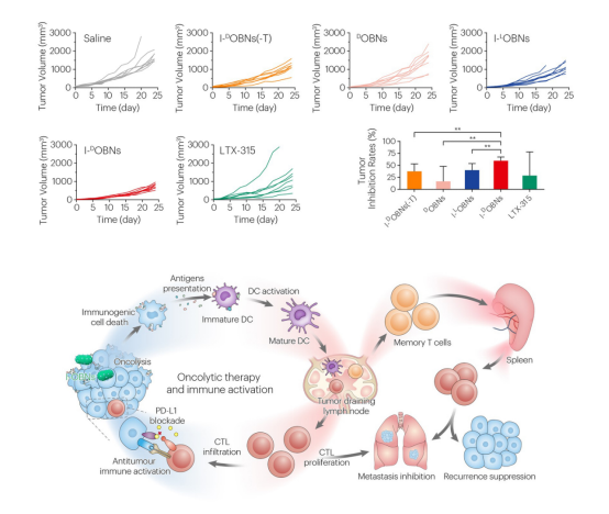 徐翔晖/李亚超研究团队聚焦于溶瘤多肽药物基础与应用研究中的关键挑战。在前期研究中,该团队提出了生物活性多肽药物结构的原始创新设计理论,成功构建了手性仿生溶瘤多肽药物,为解决溶瘤多肽药物活性不足的问题提供了全新的解决方案。近期,研究团队从多肽药物仿生制剂学的角度出发,以多层次模拟溶瘤细菌的结构与功能为思路,成功发展出了可实现系统给药、激活肿瘤微环境、重编程免疫微环境的多肽仿生溶瘤细菌药物。研究结果显示,通过静脉注射仿生溶瘤细菌药物,可实现手性色氨酸支化溶瘤肽的靶向溶瘤效应,融合分子治疗成功解除了溶瘤诱导的免疫抑制,从而有效遏制了荷瘤小鼠模型中的肿瘤增长和肿瘤转移,显著抑制了肿瘤的复发。相比之下,D型仿细菌溶瘤药物(DOBNs)表现出比L型仿细菌溶瘤药物(LOBNs)及临床级溶瘤肽更强的溶瘤疗效。